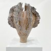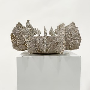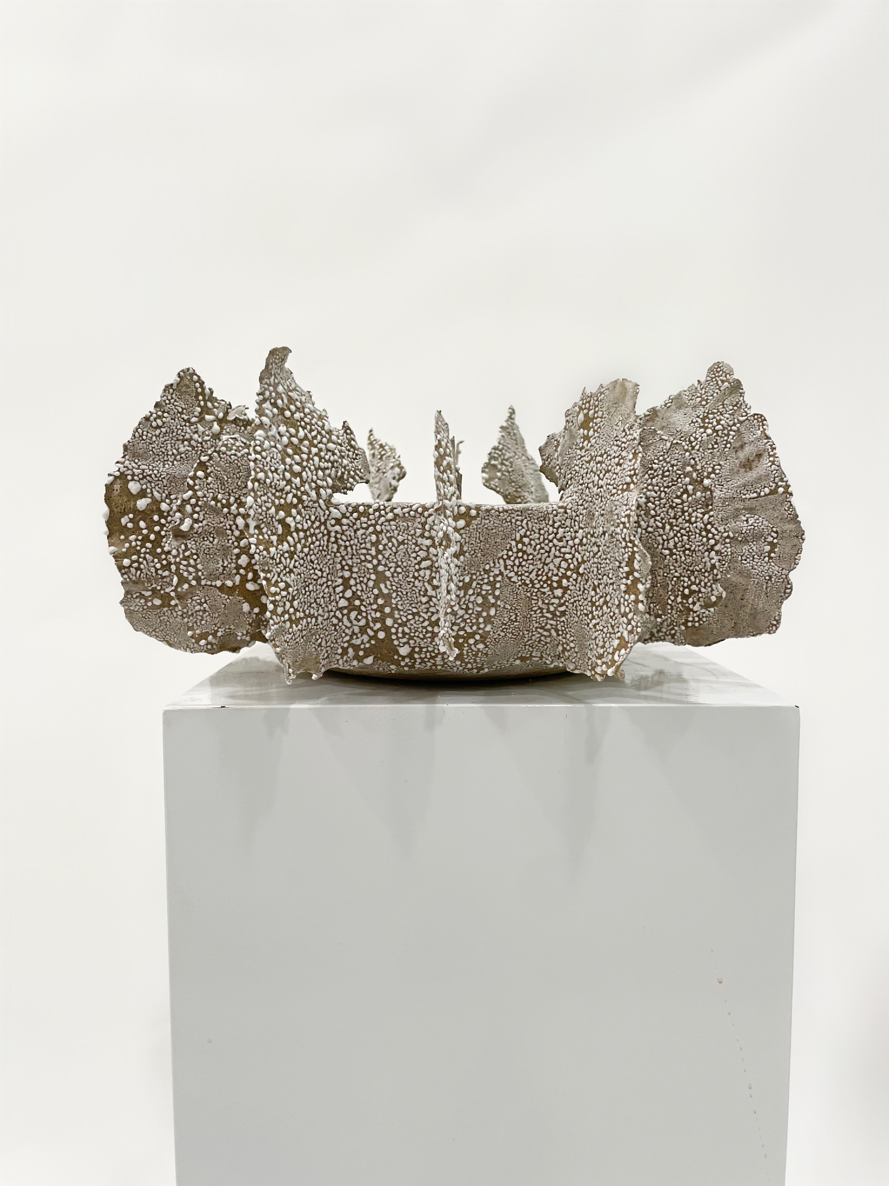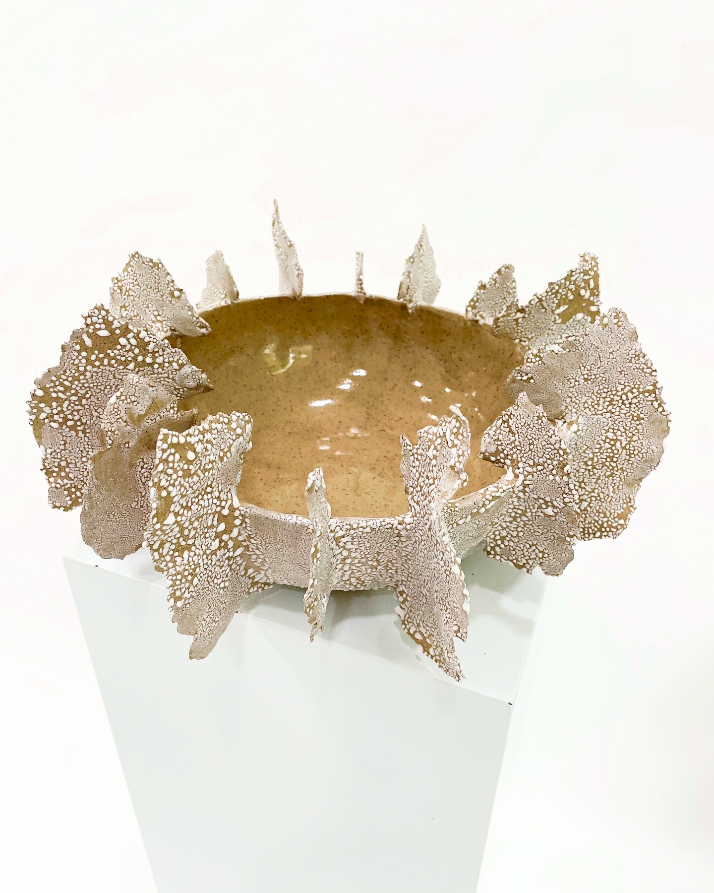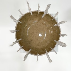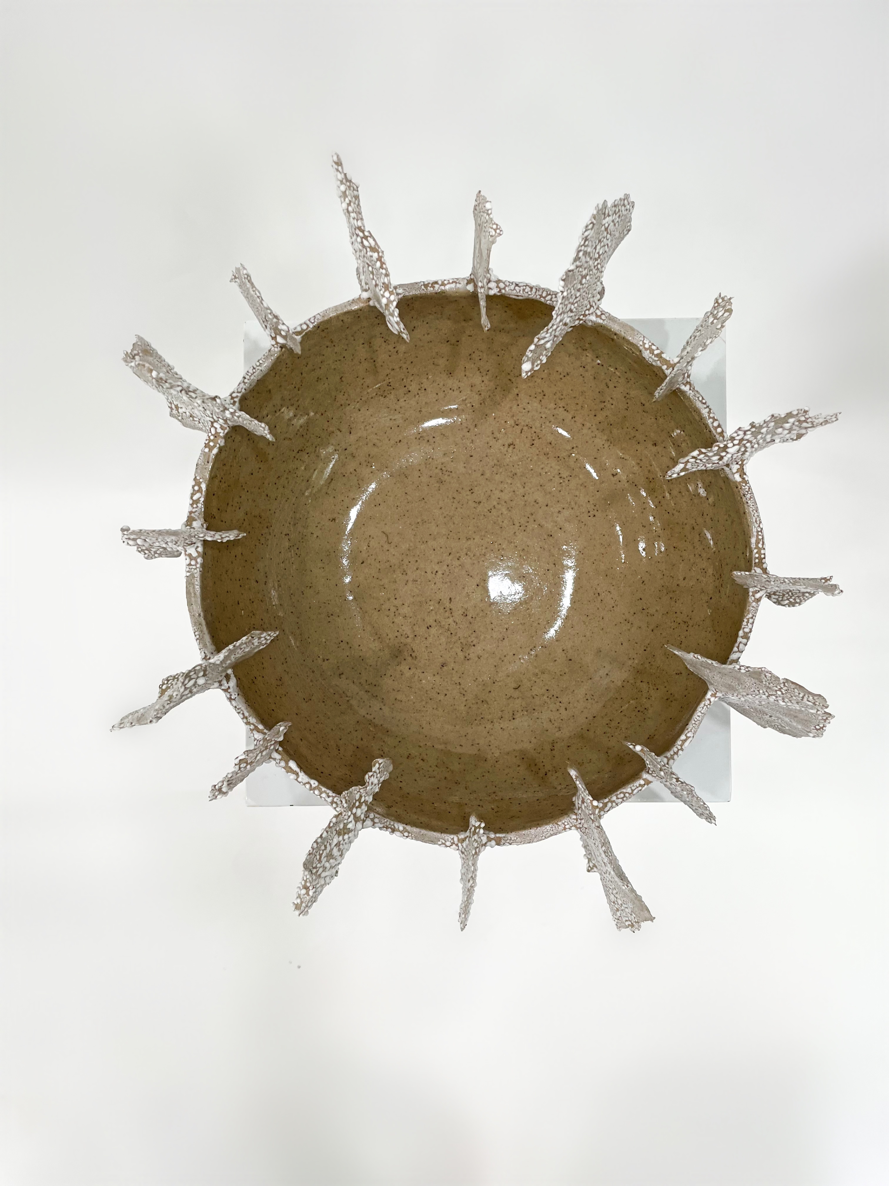 This bowl is made of warm, cinnamon color clay with speckles. On the inside is a clear glaze to show the natural color of the clay. The outside leaves and bowl body have white textured glaze.