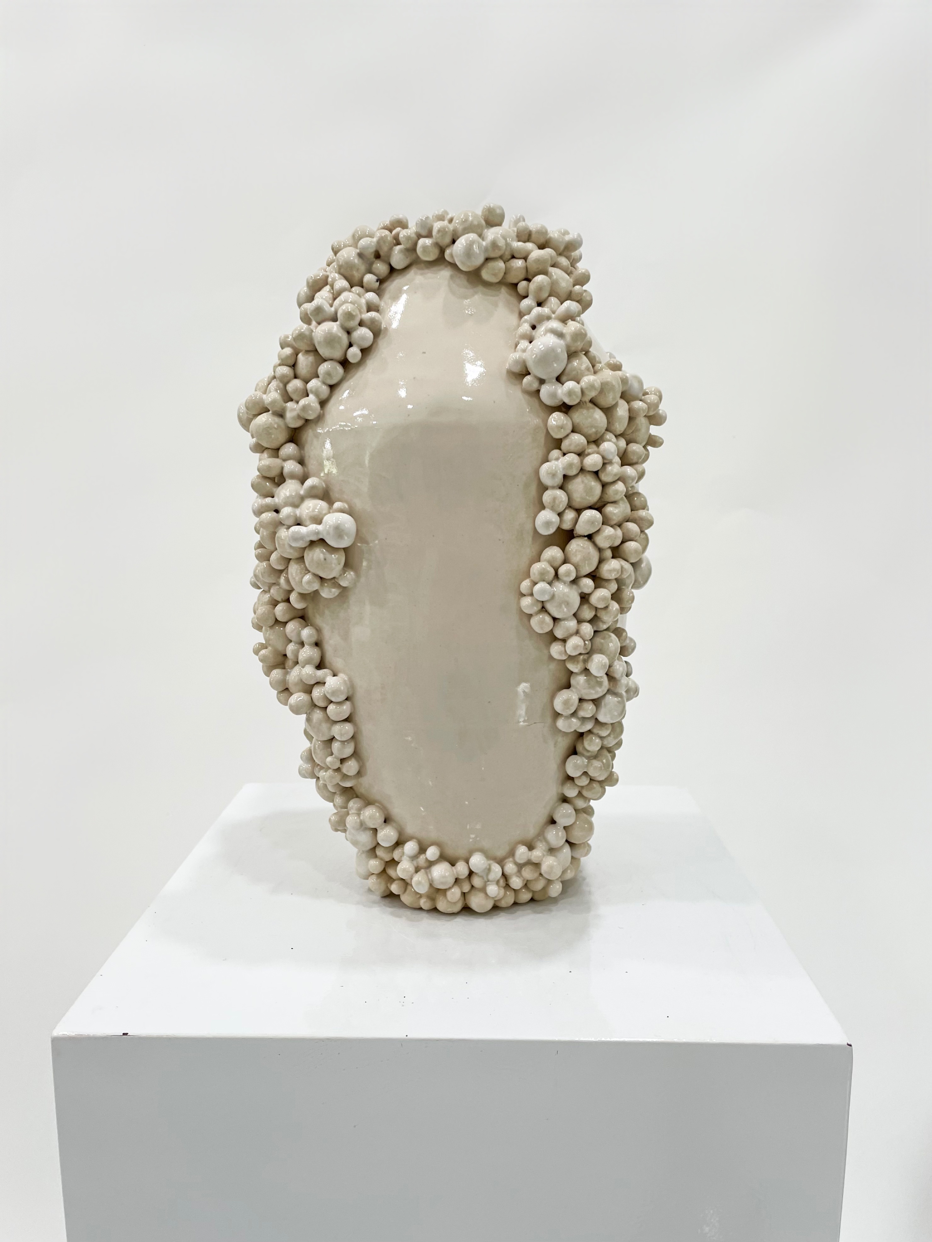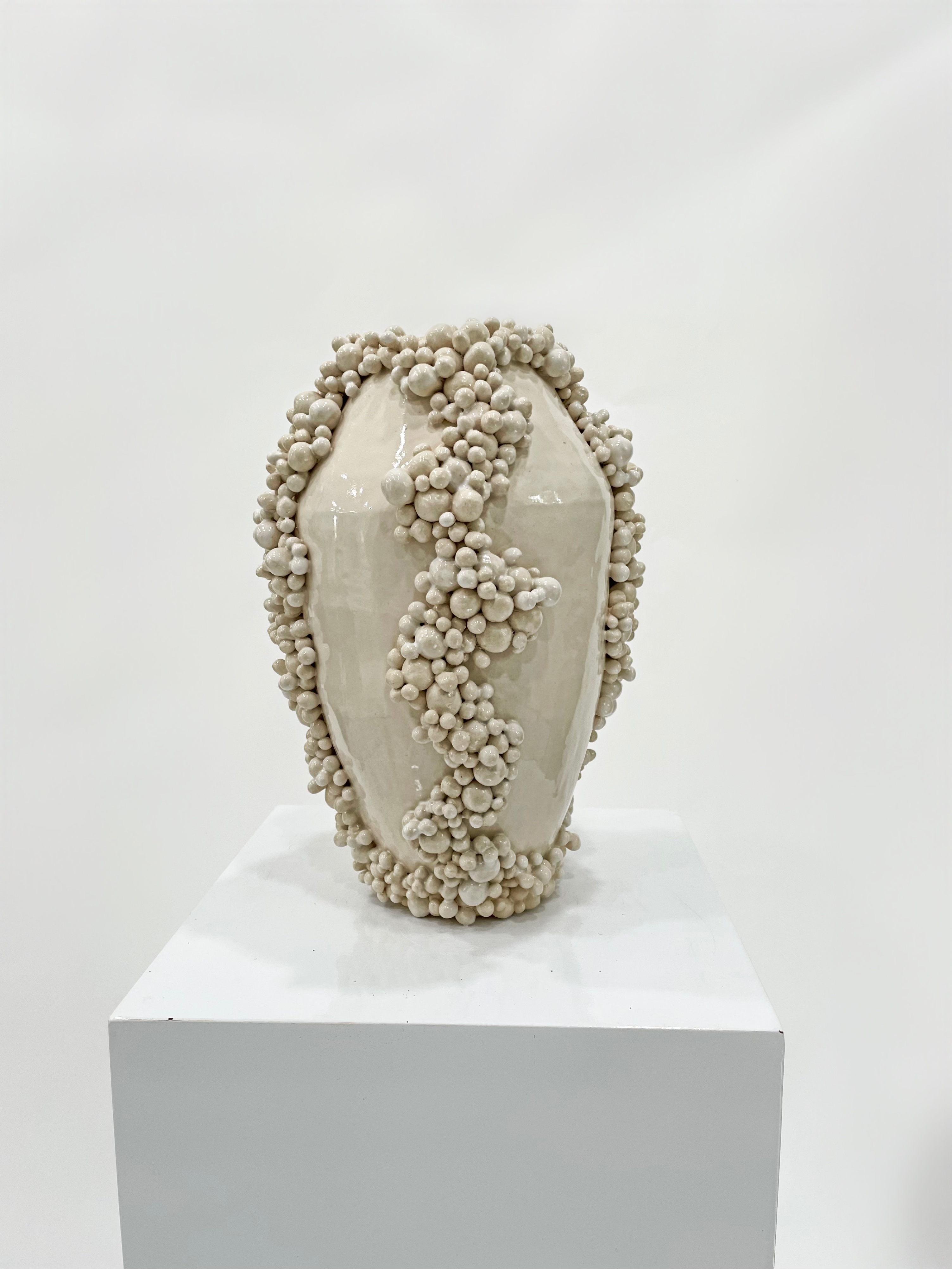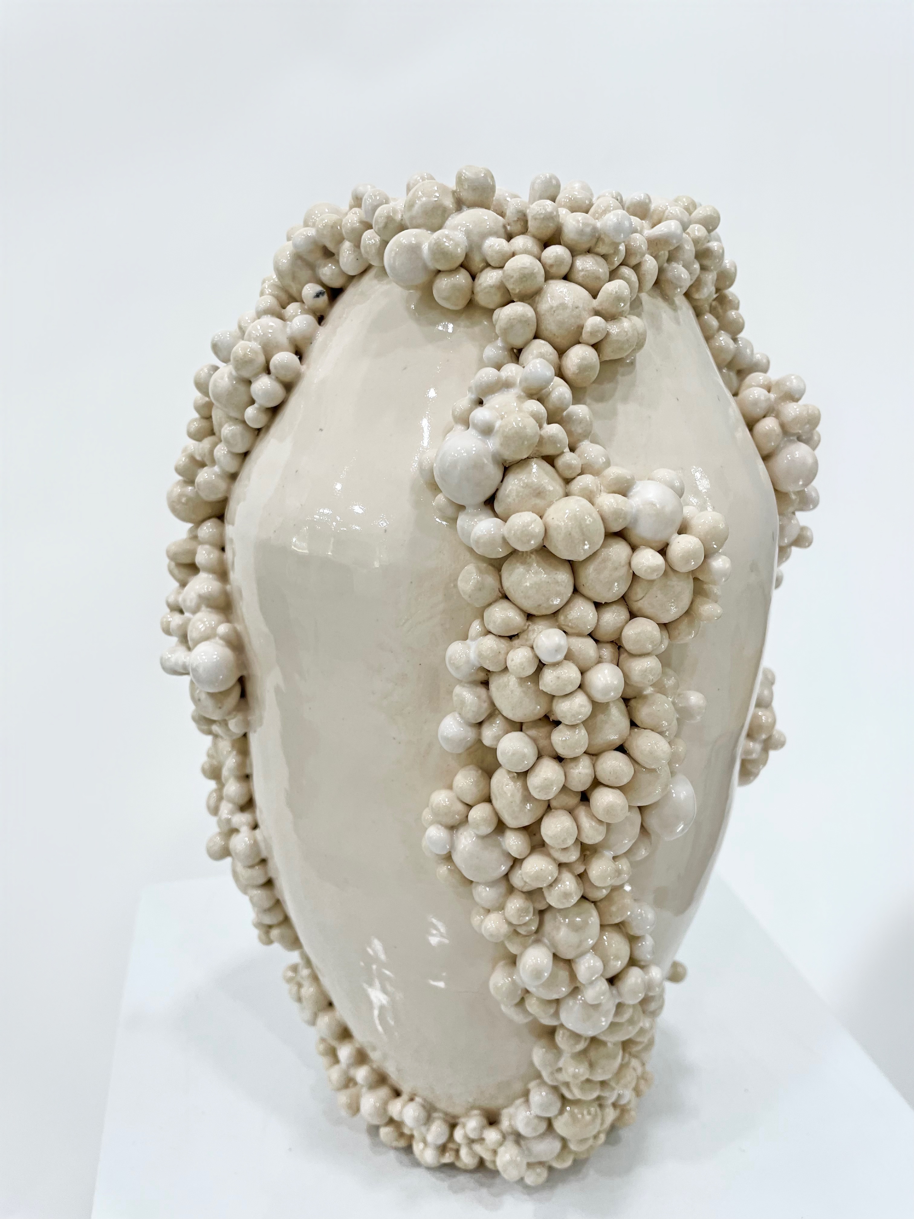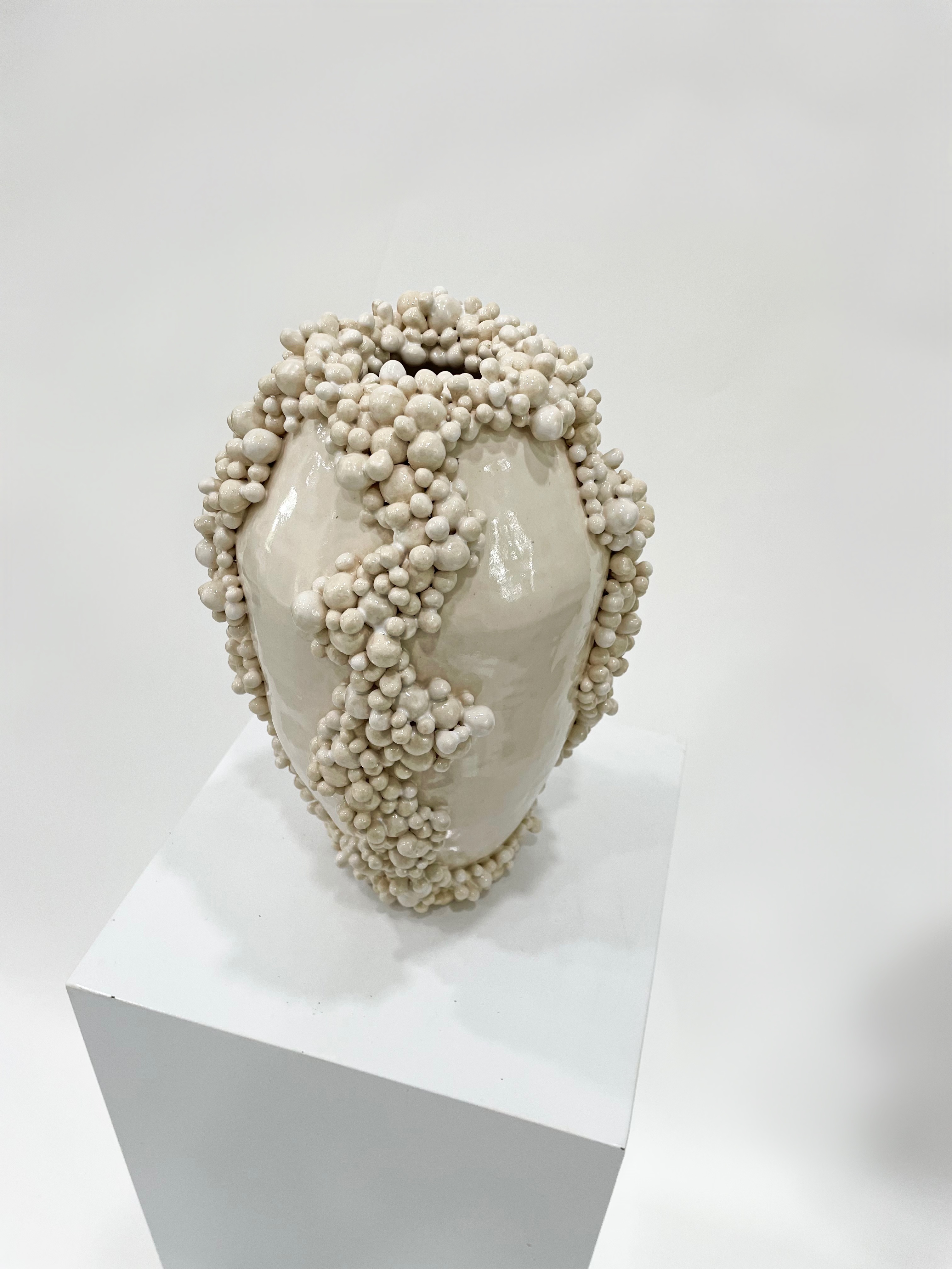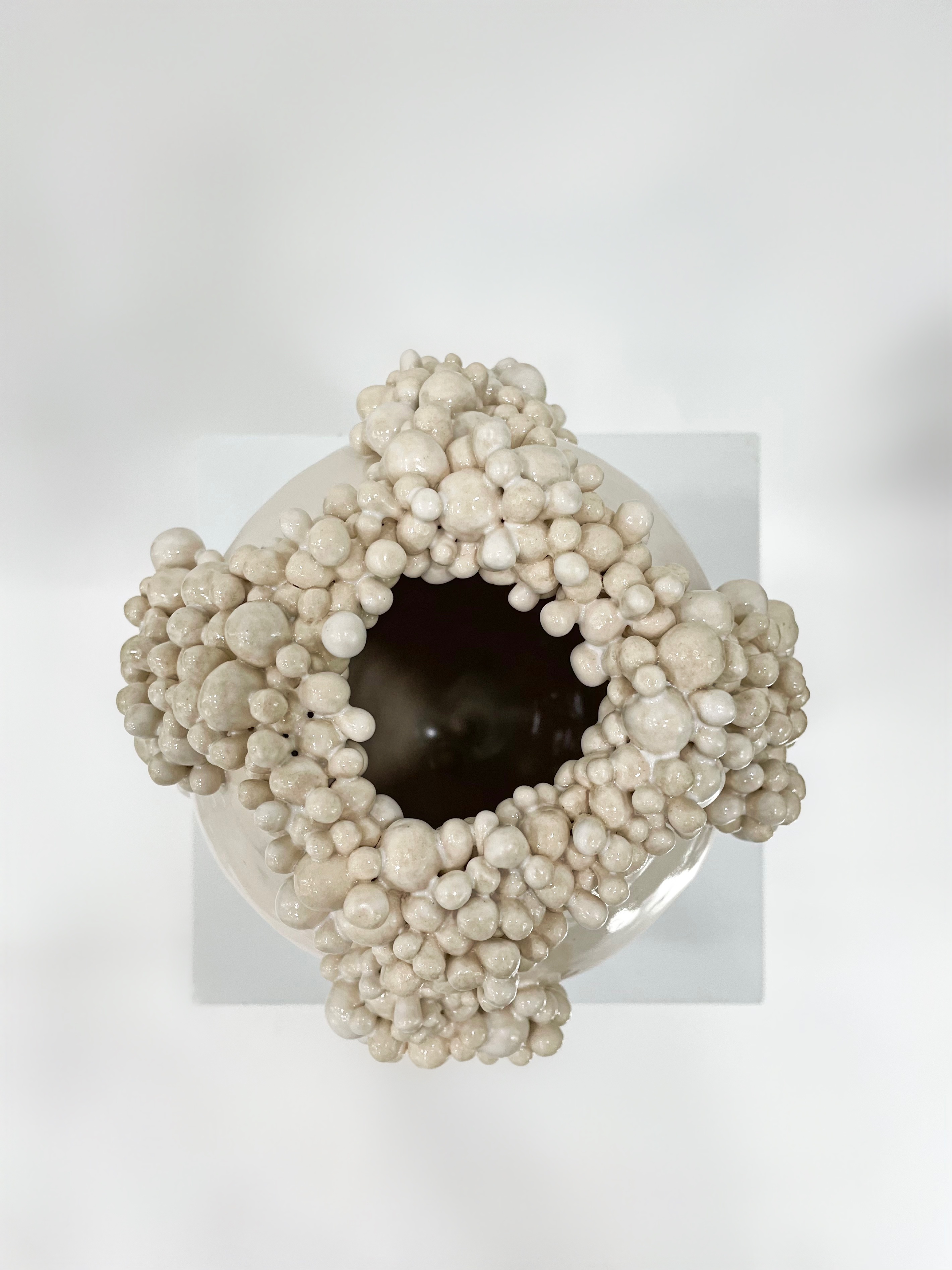 Vase made out of white clay with over a thousand individually made little balls attached in wavy pattern around the vessel as well as around the rim.