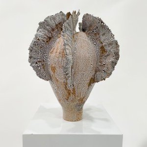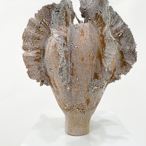 Tall vase made of light brown clay with white textured glaze. Elegant look of this piece will make it the perfet addition to a stylish home.